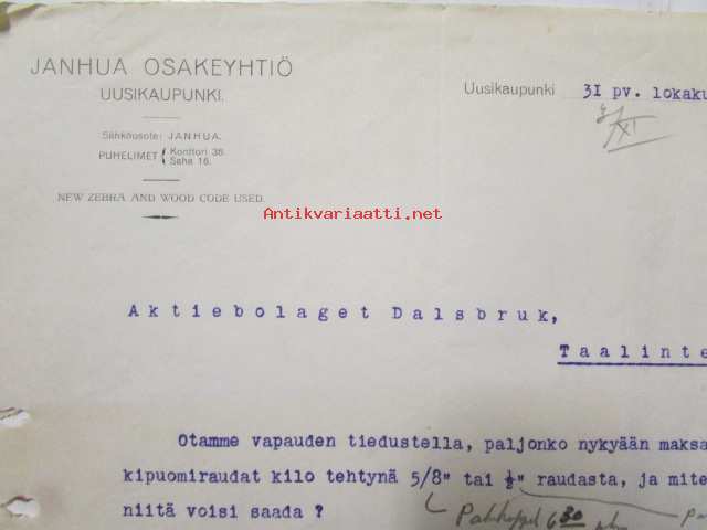 Janhua Osakeyhtiö, Uusikaupunki 31. lokakuuta 1921. -asiakirja