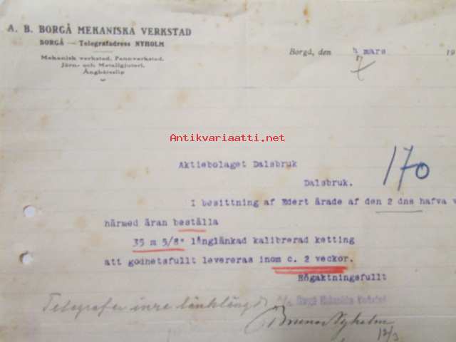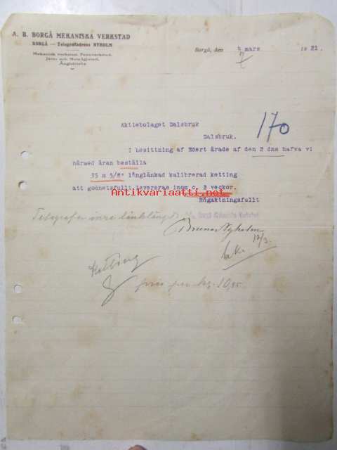 A.B. Borgå Mekaniska Verkstad, Borgå 4 mars 1921. -asiakirja