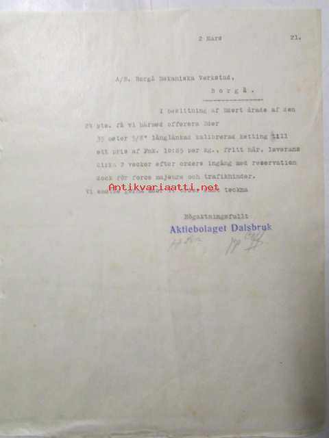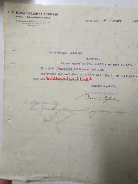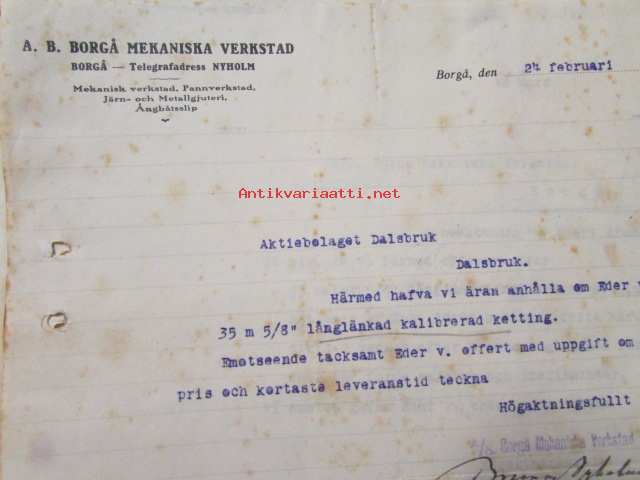 A.B. Borgå Mekaniska Verkstad, Borgå 24 februari 1921. -asiakirja