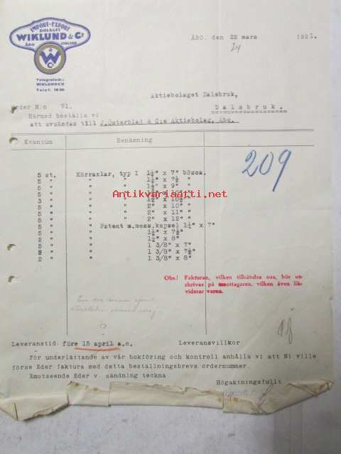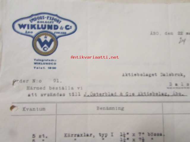 Wiklund Import Export bolaget, Abå 22 mars 1921. -asiakirja