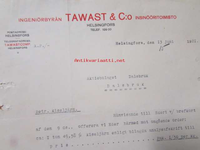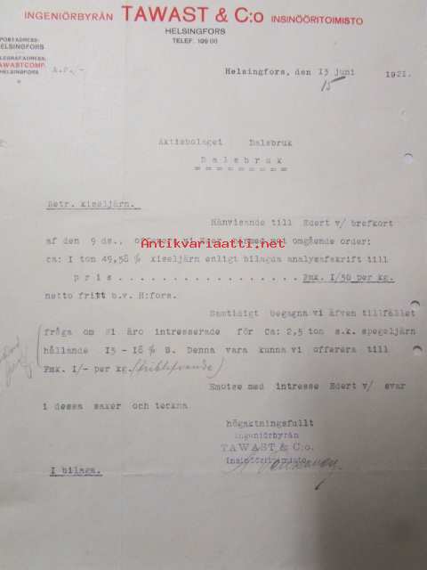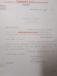 Ingeniörbyrån Tawast & C:o Insinööritoimisto, Helsingfors 13 juni 1921. -asiakirja