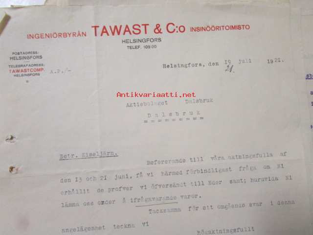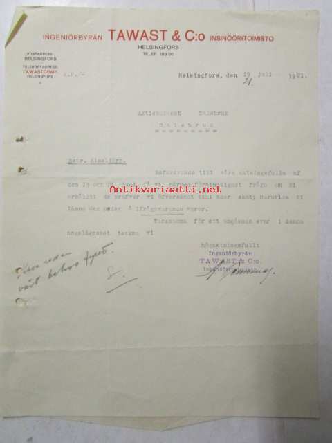 Ingeniörbyrån Tawast & C:o Insinööritoimisto, Helsingfors 19 juli 1921. -asiakirja