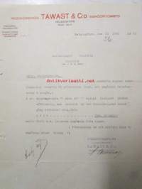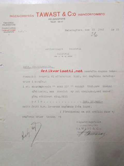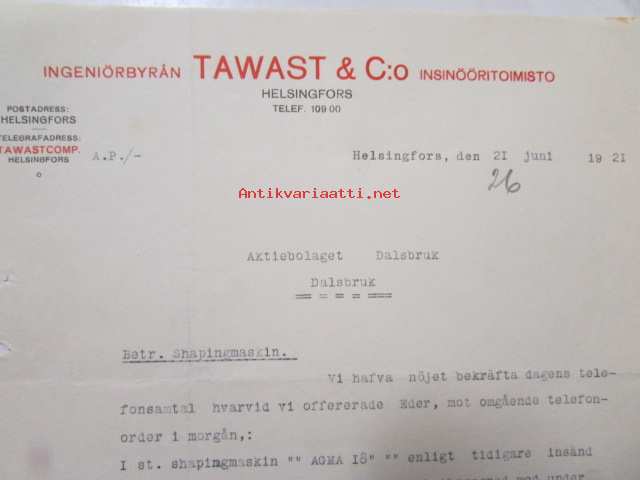 Ingeniörbyrån Tawast & C:o Insinööritoimisto, Helsingfors 21 juni 1921. -asiakirja