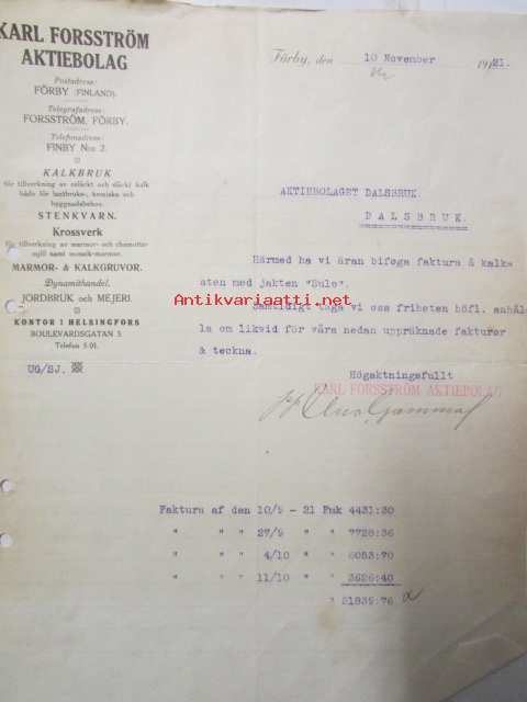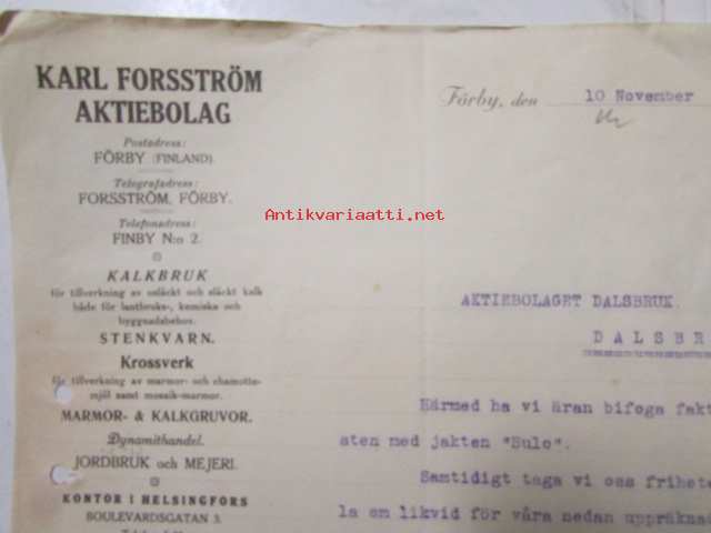 Karl Forsström Aktiebolaget, Förby 10. novenber 1921. -asiakirja