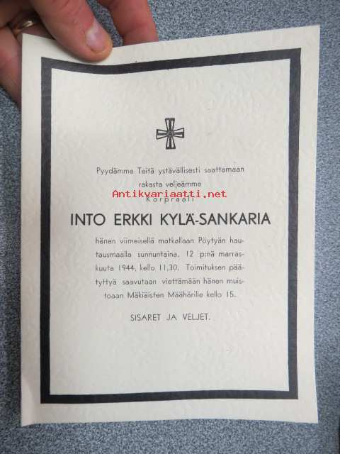 Pyydämme Teitä ystävällisesti saattamaan rakasta veljeämme Korpraali Into Erkki Kylä-Sankaria hänen viimeisellä matkallaan Pöytyän hautausmaalla 12.11.1944, hautajaiskutsu sankarivainajalle -hyvin säilynyt kirjapainon arkistokappale