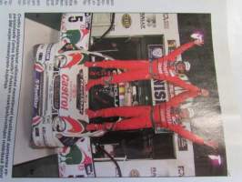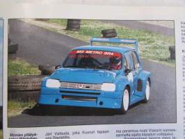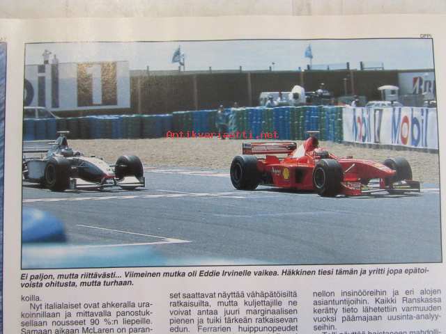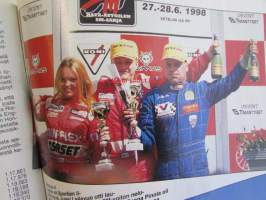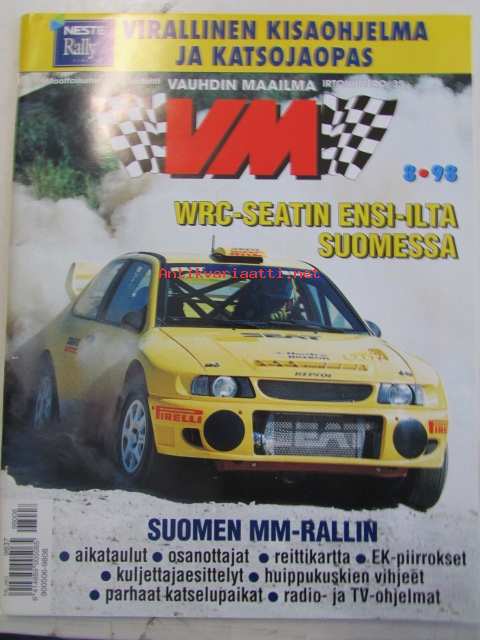 Vauhdin Maailma 1998 nr 8 -mm. Silverstonen taustat Mitä kuissien takana tapahtui?, formula 1 Ranska Englanti ja Itävalta Siniristiliput valoillaan, MM-ralli Uusi Seelanti Sainzilla eniten voittoja, Bongauskilpailu Tarra autoon, Channel 4 -ralli Asvaltti ratkaisi sorarallissa, Volvo 940 Taksimalli sorasinko, Haapsalu-ralli Isällinenkolmoisvoitto, SM-rallisprint Jalasjärvi Vaala Metro kulkee asvatilla, EM-rallicross Hämeenlinna "Kolttapojille kaksi voittoa, Harri Rovaperä Etuvetoisesta nelikkoon, Mäkikisa Mount Washington Suomalais turisti voitti, CART Portland Cleveland ja Toronto Zanardi karkaamassa, Rata-SM Kemora Kaksi miestä kaksi luokkaa, Drag-EM Alastaro Huippuaikoja ja hermosotaa, JM-SM yleinen Kokemäki Melkein merkkiluokkaa, JM-SM naiset Lappajärvi vaihteeksi Kovalainen, BMW 328 Tyhjäkäynnillä sakko vauhtia, Tommi Ahvala Trialin suurlähettiläs, Elämäni kisa Juha Miettinen. Ei sisällä kisaohjelmaa.