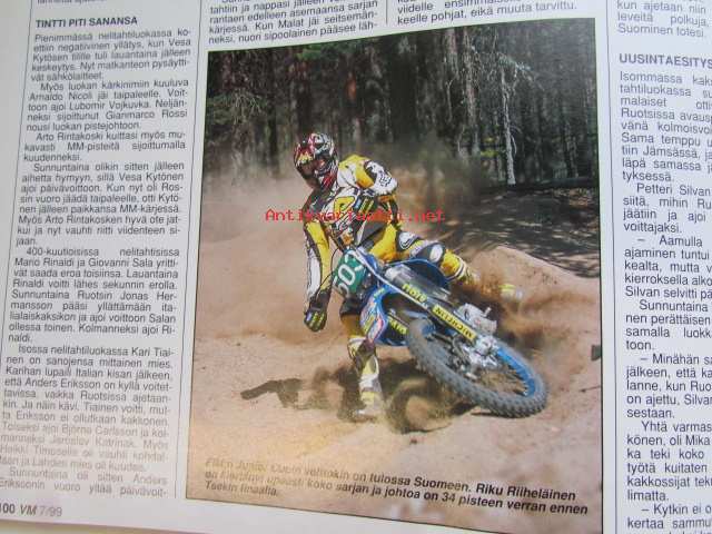 Vauhdin Maailma 1999 nr 7 -mm. Jarmo Mahonen AKK Katsoja käyttäymiset huolestuttaa, Giorgio Piola piirrokset kertovat, Formula 1 GP.t Espanja Mika ja Kuningas Kanada vihdoin onnistuminen, Indy 500 USA, Le Mans Ranska, Rata-SM Alastaro, Ralli-MM Kreikka, Ralli-SM Hagsströmmin neljäs, Ralli SM Nuoret ja Naiset Vääksy, Historic-Ralli Huittinen, Yamaha WR 400 F, Enduro-MM:t Italia Ruotsi ja Suomi, Drag-EM ALastaro, Elämäni kisa Eija Jurvanen.