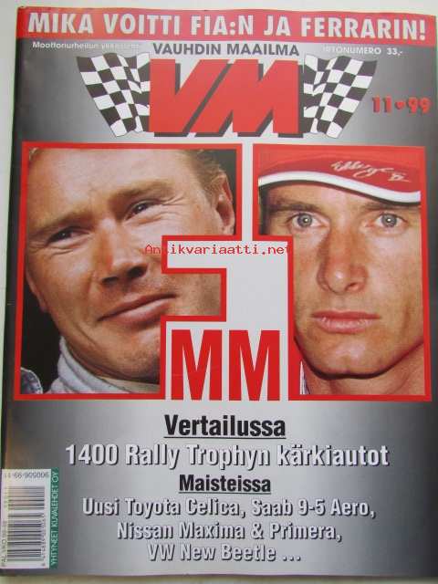 Vauhdin Maailma 1999 nr 11 -mm. Formula 1 Japani ja Malesia "Schumin" paluu, Europen Truck Raicing Cup Espanja Luostarinen pysysi mitalikannassa, Alastaro pakkohuutokupattiin Onko tässä uusi alku?, Ralli-MM italia Asvalttikuningas, Ralli-SM Hyvinkää Mestarit näyttävät osaamisensa, Historic Rally Trhopy Nokia Golf-Mestari hallitsi, David Lapworth Subaru Matalan profiilin insinööri, 1400 Rally Tropyhn autot, Toyota Celcia, Saab 9-5 Aero 2.3, Ford Focus, Mercedes-Benz CLK Carlsson, Nissan Maxima, Nissan Orimera, VW Beetle, Motocrossin joukkue-MM ja-SM Brasilia ja Vantaa Suomalaiset sambasivat jälkijoukoissa, Elämäni kisa Jukka Pelttari.21 x 29 cm.