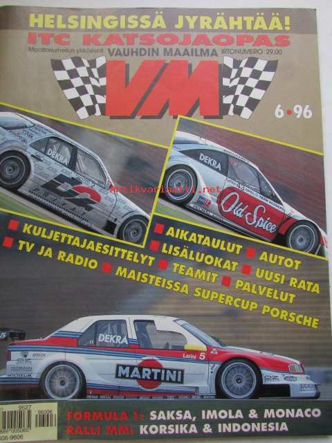 Vauhdin Maailma 1996 nr 6 -mm. Formula 1 GP:t Eurooppa ja San Marino ja Monaco, Kotimaan ratatestipäivät Sport 2000 ja SS-luokat, VM esittelee kemiläisen Esort se kuuluisa esko, Ralli-MM Korsika ja Indonesia, Keräilykuvassa Jacques Villeneuve, Tulospörssi, Varikolla kuiskitaan, Huohotinputki, Tapahtumakalenteri, Rallicross-EM kolme kisaa jo ajettu, Drag-SM Alastaro miki veti vitosen, Anita Mäkelä koelensi Hawkin, VM maistelee Peugeot 106 GTi ja Ralley 1.6 ja Nissan Almera GTi ka Yamaha XT500, RR-MM Japano ja Espanja.21 x 29 cm.