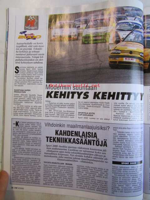 Vauhdin Maailma 2000 nr 5 -mm. N-Ryhmä muuttumassa Sääntövahvistusta odotetaan, Formula 1-MM San Marino ja Englanti Suomalaisittain väärä järjestys, Crtepillar TRD 2000 Supertruck, Kv-pikkuformulat Suomalaisia kaikkialla, Rata-SM 2000 tietopaketti Luokat autt kuljettajat aikataulut, Ralli-MM Espanja McRae palasi voittajaksi, Petter Solberg, Yvan Muller, RR-MM Malesia ja Japani Merkkikirjoja, Enduro-SM Päijänneajo, Aholalle toinen kilpi , ACT Labs Force RS ja RS Shifter, American Car Show Helsinki Pääsiäinen komeimmat tipu, Drag Race -2000 Näin tulevana kesänä kistaaan, Malmi Drag Race 25-vuotiasjuhlan ohjeet, Porche 911 Turbo 4Wd, BMW X5 4.4iA, BMW 320d Touring, Moto Guzzi V11 Sport, Motocross-MM Hollanti Loikkia monessa kerroksessa, Elämäni Kisa Tutu Sohlberg.21 x 29 cm.
