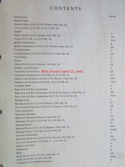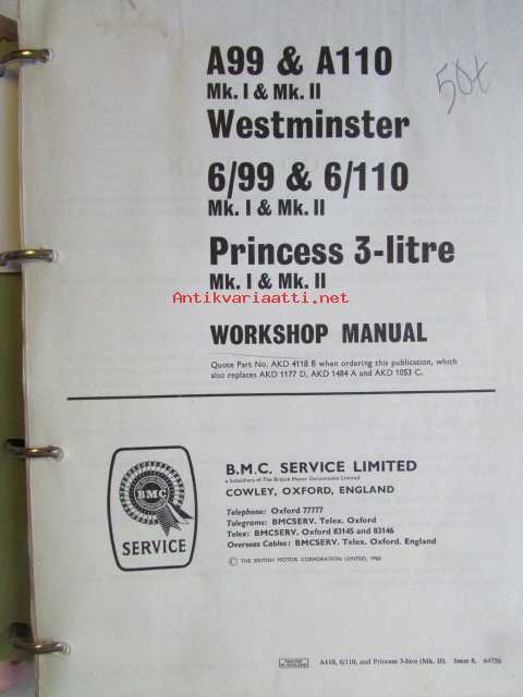 A99 & A110 Westminster, 6/99 & 6/110 Princess 3-litre Mks. I & II, Workshop Manual A BMC Service Publication -Korjauskäsikirja Katso kuvista autojen mallikuvat.