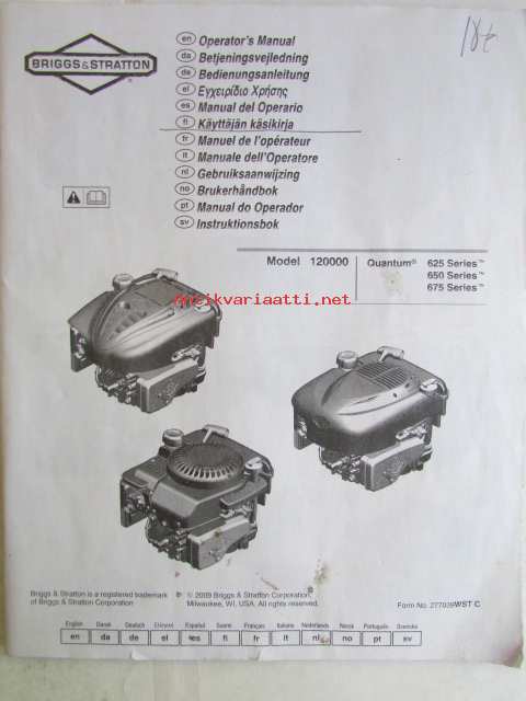 Briggs & Stratton Model 120000 Quantum 625, 650, 675 Series ™ ( form No 277039WST C) - Käyttäjän käsikirja, 12 kieliversiota.