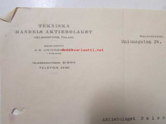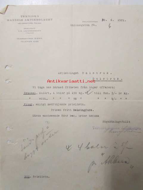 Tekniska Handels Aktiobolaget, Helsingfors 30.6. 1921 -asiakirja