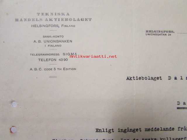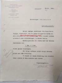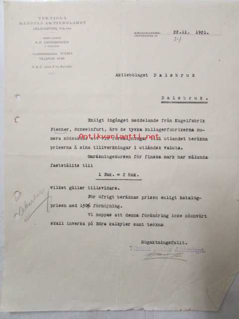 Tekniska Handels Aktiobolaget, Helsingfors 22.11. 1921 -asiakirja