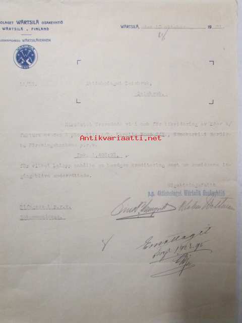Aktiebolaget Wärtsilä Osakeyhtiö, Wärtsilä 15. Oktober 1921 -asiakirja