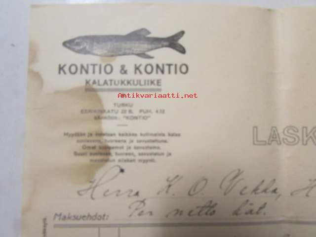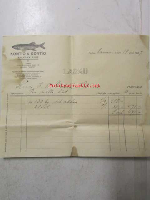 Kontio & Kontio kalatukkuliike Turku tammikuun 19. 1927 -asiakirja