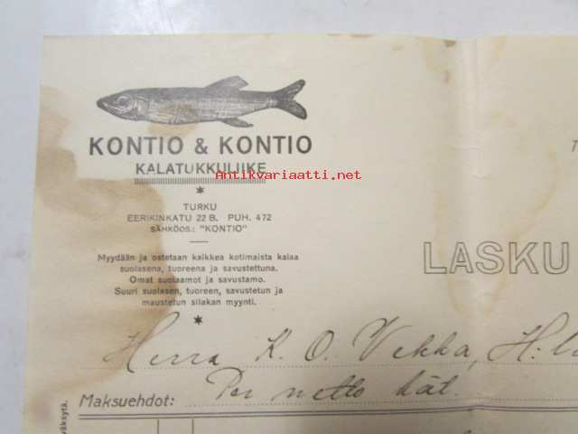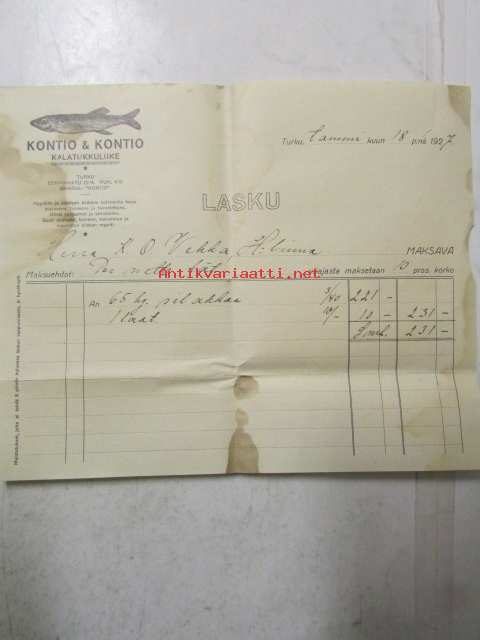 Kontio & Kontio kalatukkuliike Turku tammikuun 18. 1927 -asiakirja