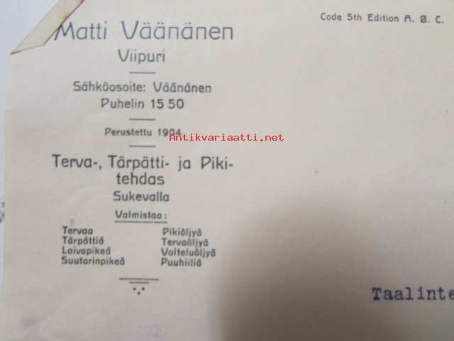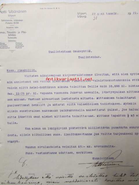 Matti Väänänen Terva-, Tärpätti-, ja Pikitehdas, Viipuri 27. tammikuuta 1921 -asiakirja