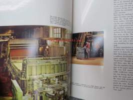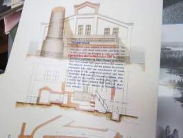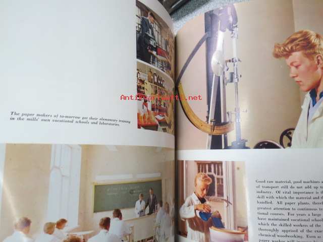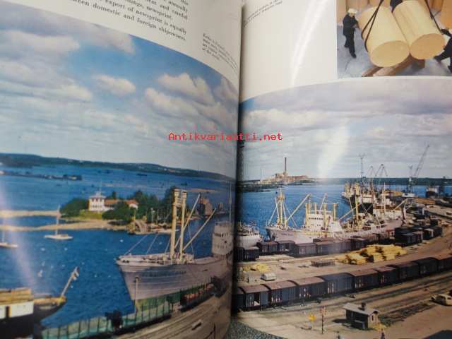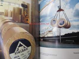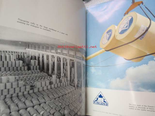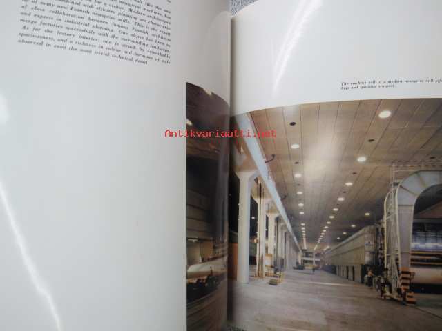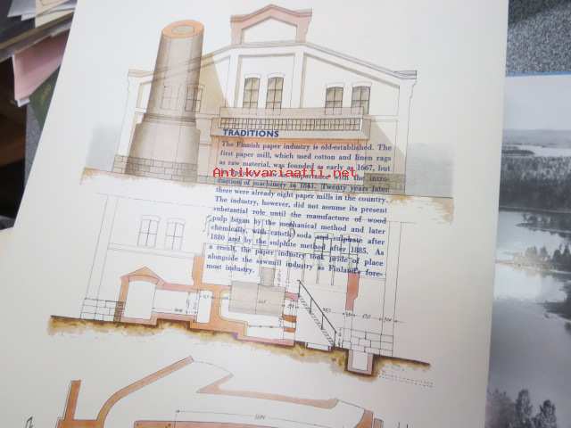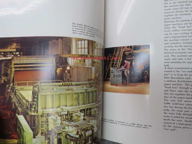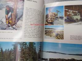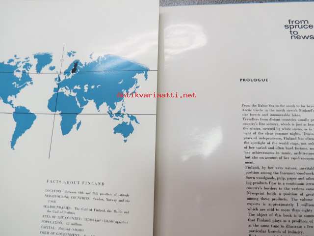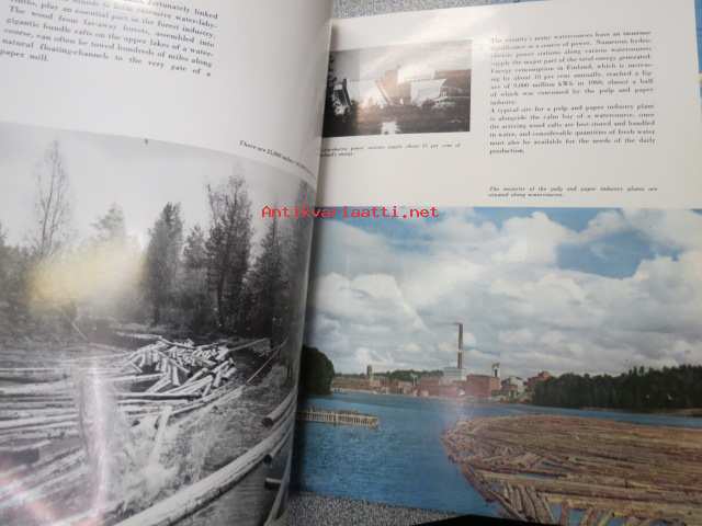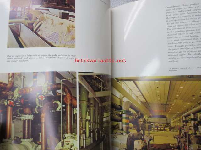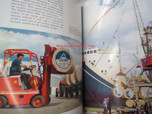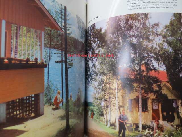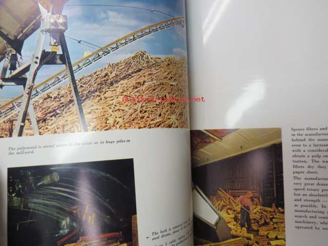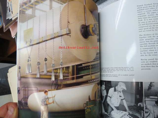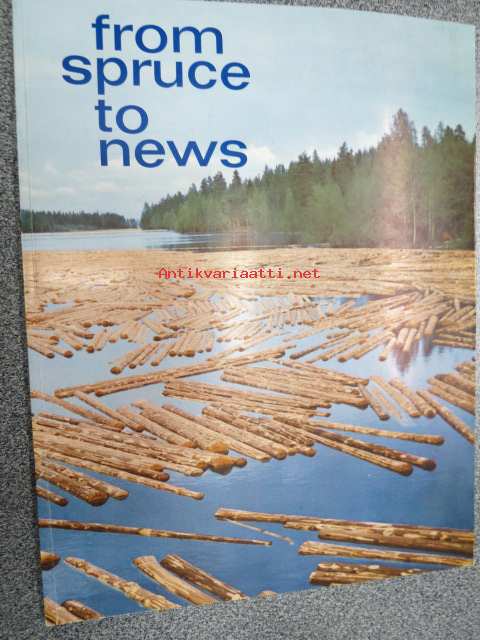 From spruce to news -esittelee suomen puunjalostusta raaka-aineesta valmiiksi sanomalehtipaperiksi, todella hyvä kuvitus koko tuotantoketjusta alkaen metsurien töistä ja päätyen tehtaitten kautta kuljetuksiin ym. 21 x 27 cm.