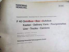 Hanomag, 1974Hanomag Henschel, F40 - Omnibus-Bus - Autobus Kasten - Delivery Vans - Fourgonnettes - Lkw - Trucks - Camions, Ausgabe B 1974-varaosakirja, Katso tarkemmat moottori ja mallimerkinnät.