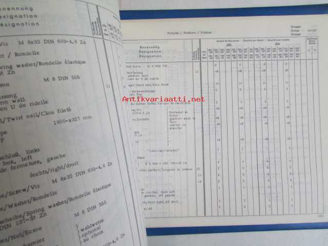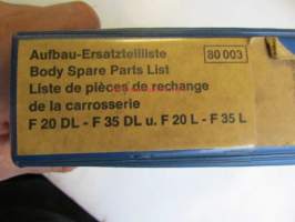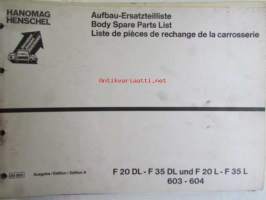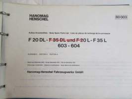 Hanomag Henschel, Body F 20 DL- F 35 DL und F 20 L- F35 L, 603-604, - F46KA-L, Ausgabe A 1972 -Varaosakirja, Katso tarkemmat moottori ja mallimerkinnät.