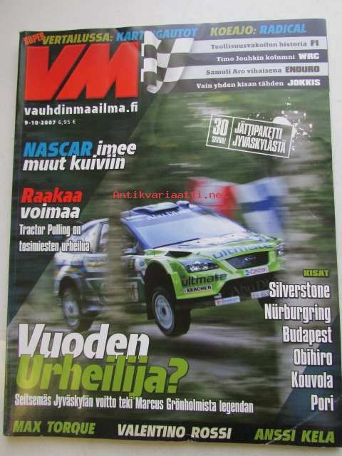 Vauhdin Maailma 2007 nr 9-10 -mm. Formuloissa tieto liikkuu laittomasti, Formula 1 GP:t Eurooppa, Iso-Britannia ja Unkari, Playboy ja Rättikauppias Flavio Briatore on muutakin kuin rautainen Tallipäällikkö, Amrican malliin NASCAR, Ralli SM-Kouvola, F-Cup Kouvola, Michele Mounton olivähällä voittaa, Jesse Krohn 16v F3 mitaliehdokas, Scott Gillman on F1 veneiden kruunuprinssi, Koeajossa Päivärinnan ja Karttilan MM-sivuvaunupyörä, Rallisprintin kestomestari Tomi Hallia.21 x 29 cm.