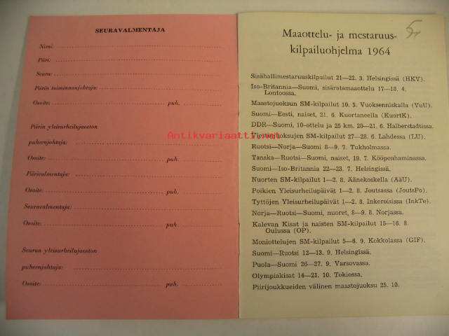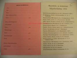 | Saatavilla | 1 kpl | | Julkaisuvuosi | 1964 | | Sivuja | 32 | | Kunto | K3 | | Sidonta/painoasu | Vihko | | Kielet | Suomi |