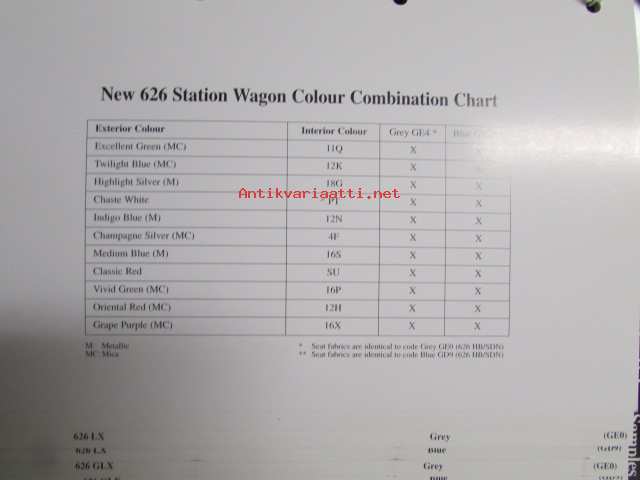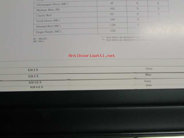 Mazda Colour Combinations, malleihin 626 Station Wagon, 626 4-door Sedan, 626 5 door Hatchback, 626 LX ja 626 GLX Ulkoväripaletti, kaikkiin malleihin voi vaihdella värin tahtonsa mukaisesti -Katso kuvasta tarkemmin.