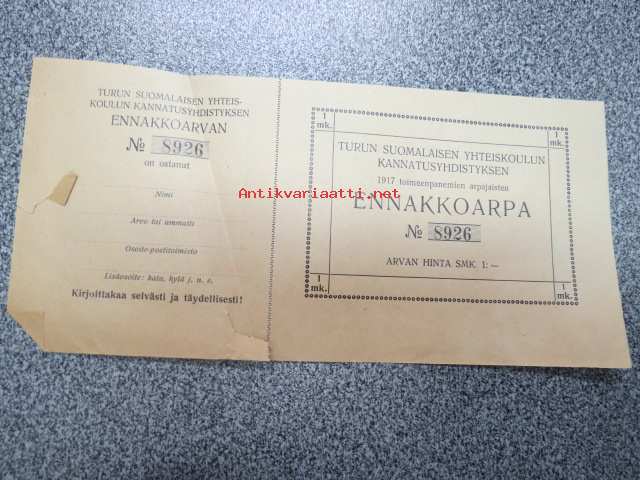 Turun Suomalaisen Yhteiskolulun kannatusyhdistyksen ennakkoarpa ja ostokuitti yhdessä nr 8926