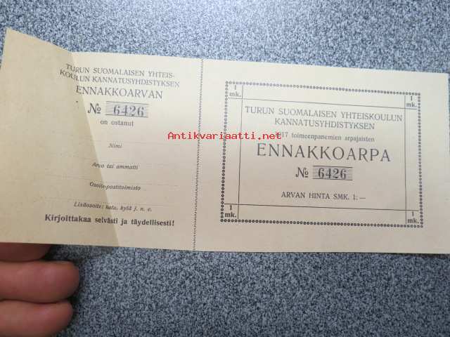 Turun Suomalaisen Yhteiskolulun kannatusyhdistyksen ennakkoarpa ja ostokuitti yhdessä nr 6426
