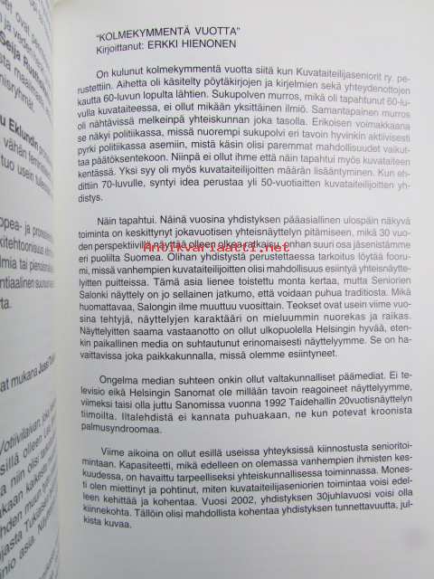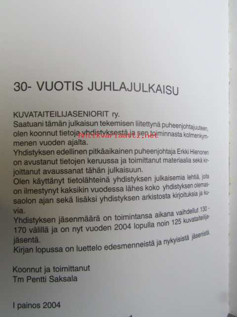 | Saatavilla | 1 kpl | | Julkaisuvuosi | 2004 | | Sivuja | 175 | | Painos | 1. | | Kunto | K3 | | Sidonta/painoasu | Nidottu (pehmeäk.) | | Kielet | Suomi |