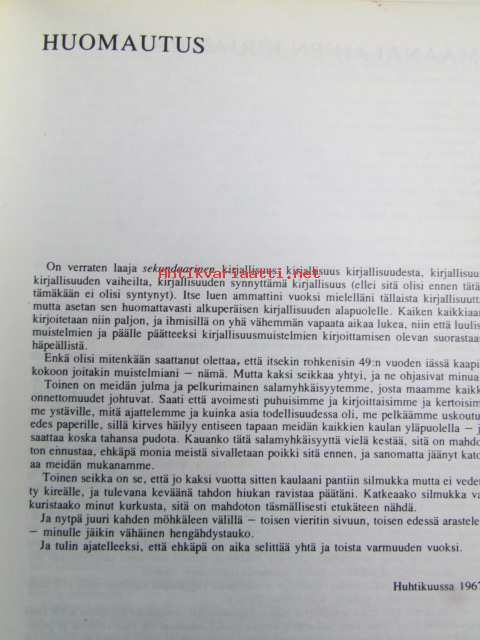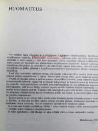 | Saatavilla | 1 kpl | | Julkaisuvuosi | 1976 | | Sivuja | 343 | | Painos | 1. | | Kunto | K3 | | Sidonta/painoasu | Nidottu (pehmeäk.) | | ISBN | 951-95191-7-3 | | Kielet | Suomi |