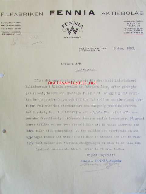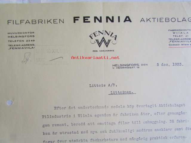 Filfabriken Fennia Aktiebolag, Helsingfors 5 dec. 1923 - asiakirja