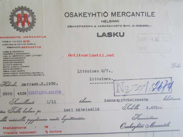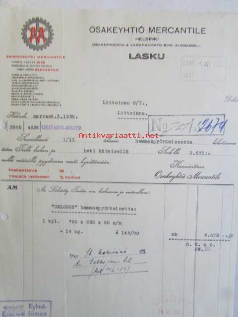 Osakeyhtiö Mercantile, Helsinki marrask. 3. 1939 - asiakirja