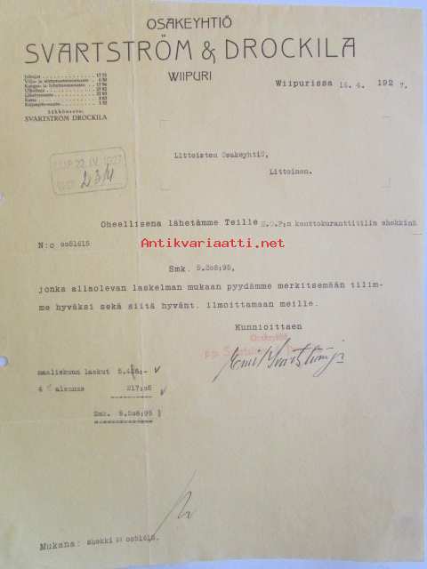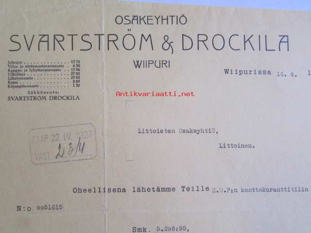 Osakeyhtiö Svartström & Drockila Wiipuri 16.4.1927 -asiakirja