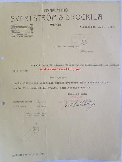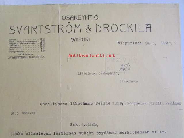 Osakeyhtiö Svartström & Drockila Wiipuri 16.5.1927 -asiakirja