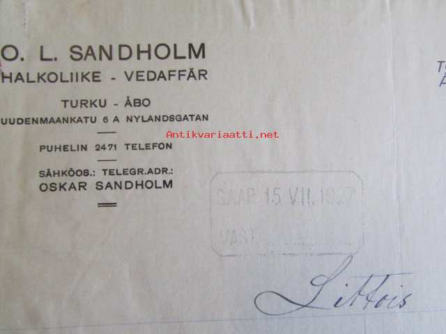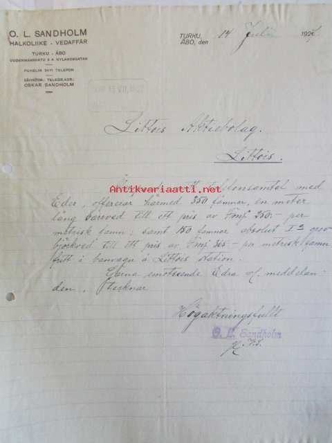 O.L. Sandholm Halkoliike, Turku 14 juli 1927 -asiakirja
