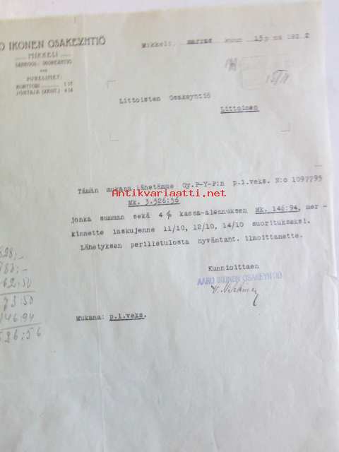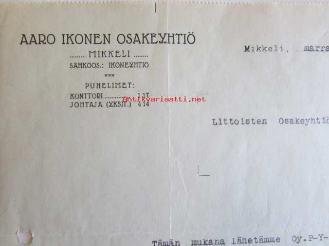 Aaro Ikonen Osakeyhtiö, Mikkeli marraskuun 13. 1922 - asiakirja