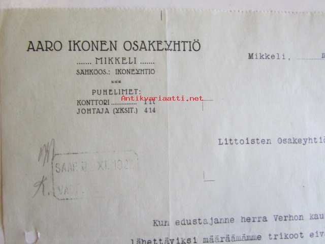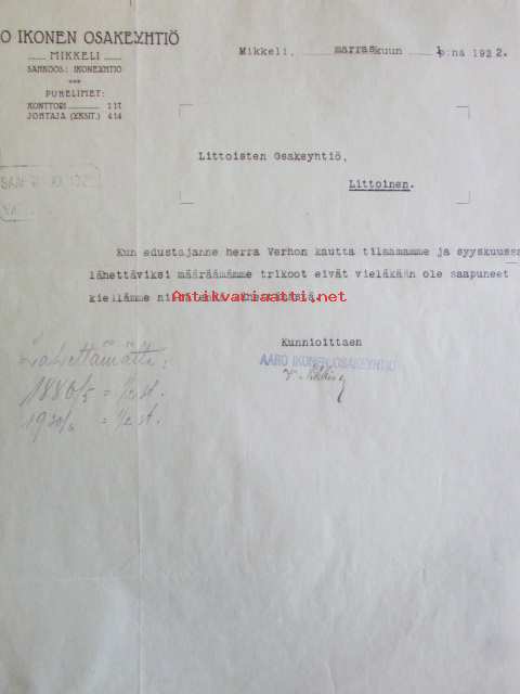 Aaro Ikonen Osakeyhtiö, Mikkeli marraskuun 1. 1922 - asiakirja
