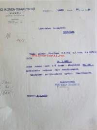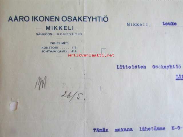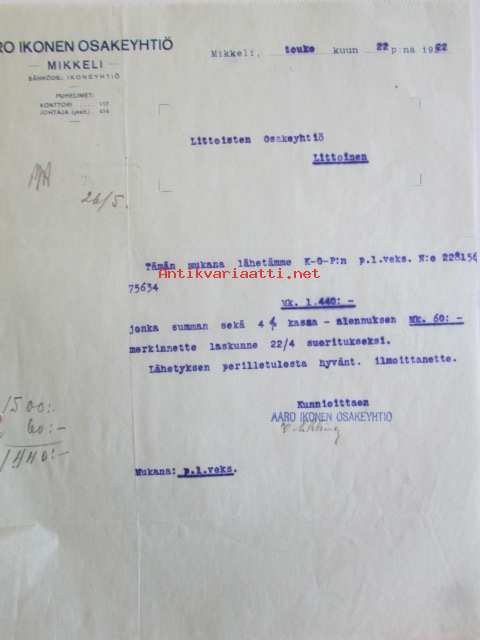 Aaro Ikonen Osakeyhtiö, Mikkeli toukokuun 22.. 1922 - asiakirja