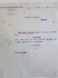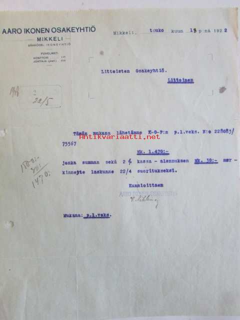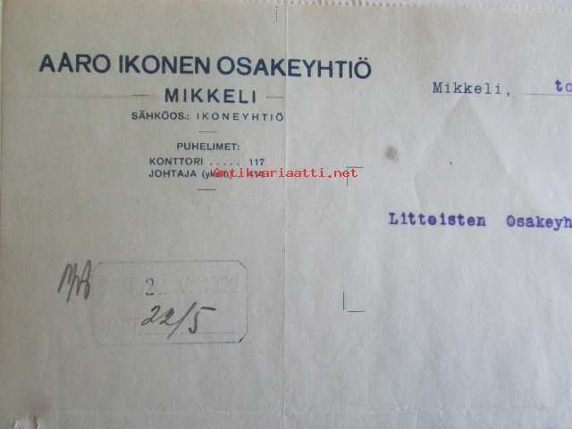 Aaro Ikonen Osakeyhtiö, Mikkeli toukokuun 18. 1922 - asiakirja