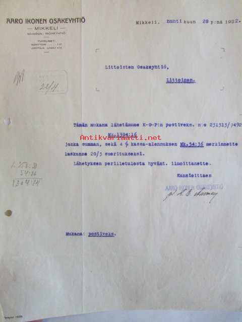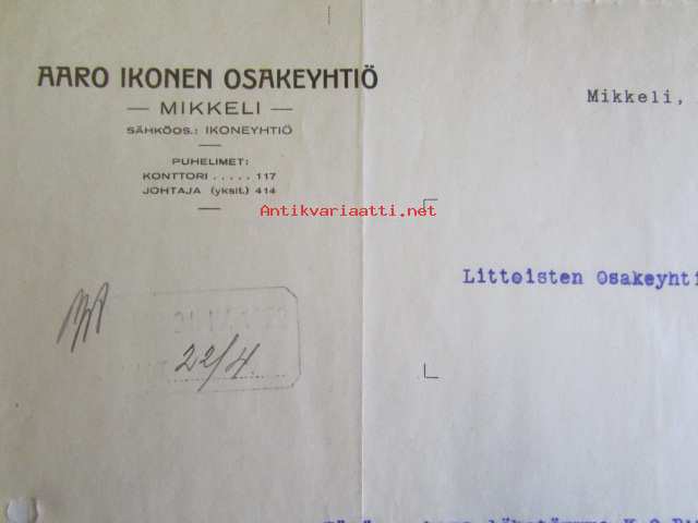 Aaro Ikonen Osakeyhtiö, Mikkeli huhtikuun 20. 1922 - asiakirja