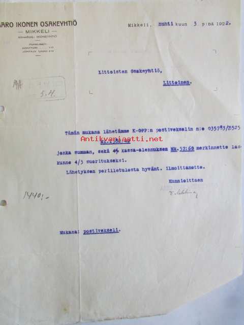 Aaro Ikonen Osakeyhtiö, Mikkeli huhtikuun 3. 1922 - asiakirja