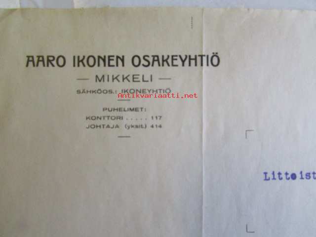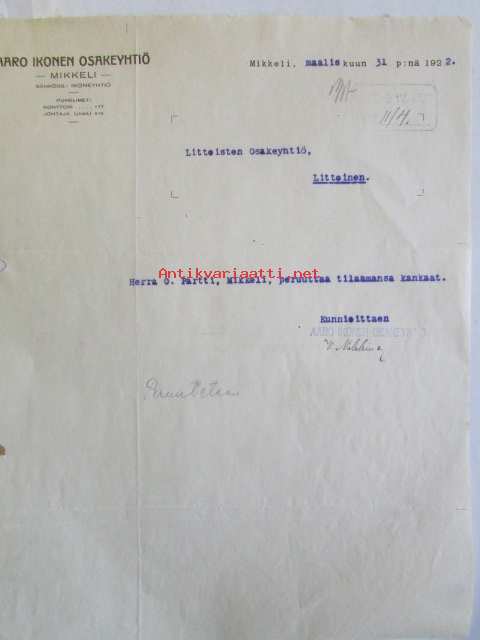 Aaro Ikonen Osakeyhtiö, Mikkeli maaliskuun 31. 1922 - asiakirja