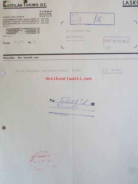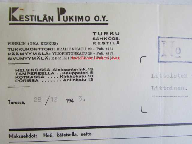 Kestilän Pukimo O.Y, Turussa 28/12 1943 -asiakirja