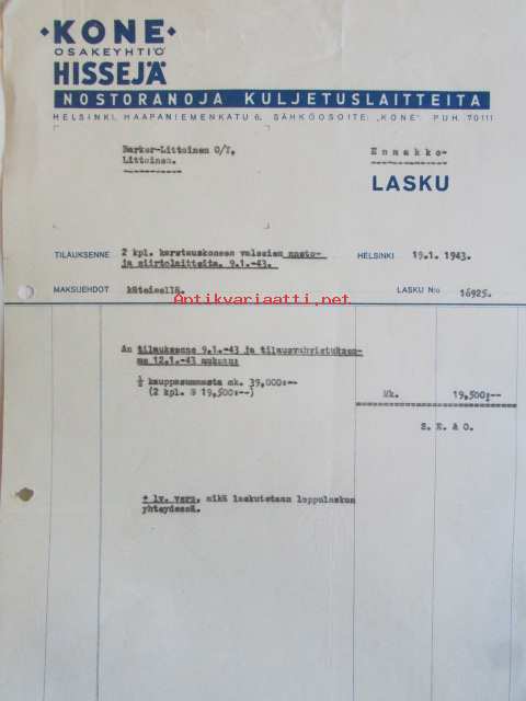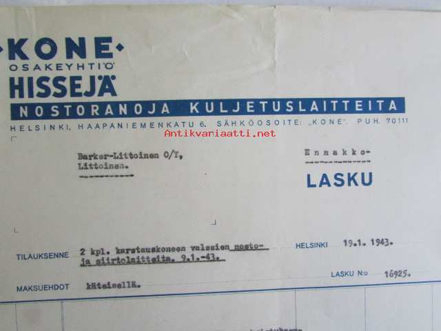 Kone Osakeyhtiö Hissejä nostokraanoja kuljetuslatteita, Helsinki 19.1. 1943. -asiakirja