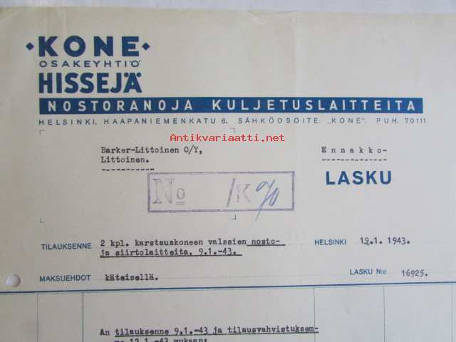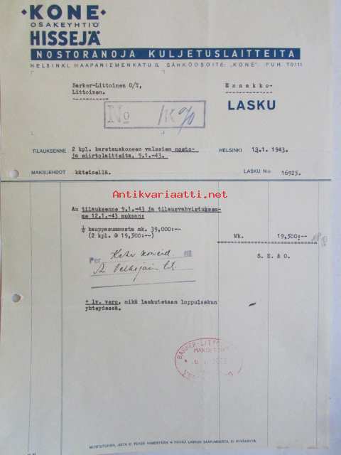 Kone Osakeyhtiö Hissejä nostokraanoja kuljetuslatteita, Helsinki 19.1. 1943. -asiakirja
