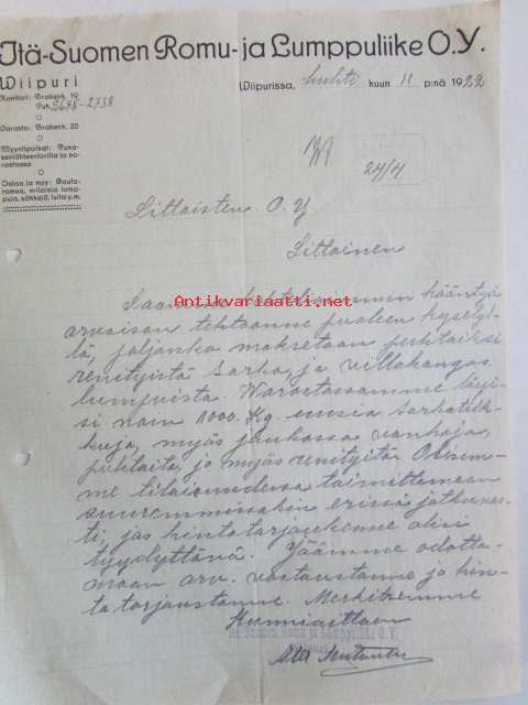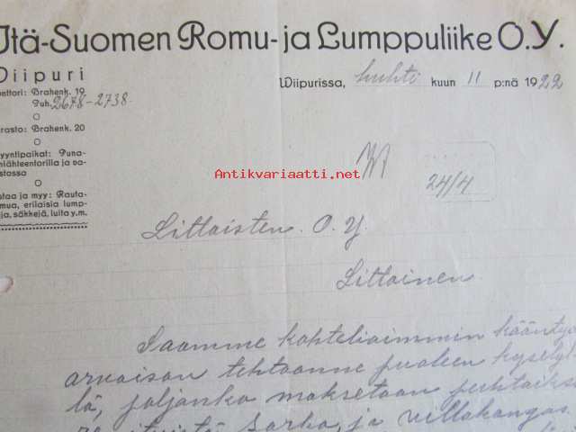 Itä-Suomen Romu- ja Lumppuliike, Wiipurissa huhtikuun 11. 1922 -asiakirja