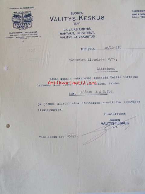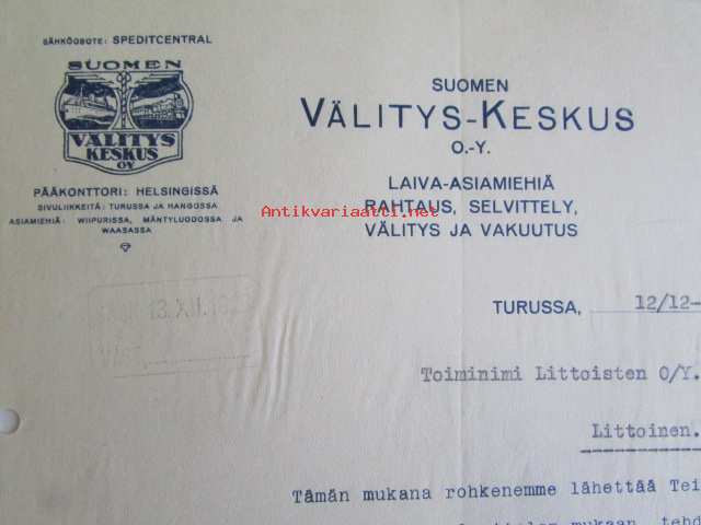 Suomen Välitys-Keskus Oy, Turussa 12/12-1923 -asiakirja