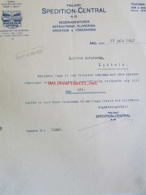 Finland Spedition-Central Ab, Turussa 13. juli 1923 -asiakirja